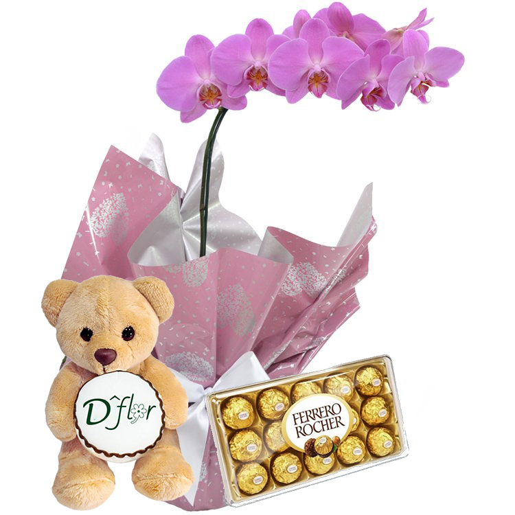 Orquídea (phalaenopsis) com 1 haste de cores vivas + 1 Ferrero Rocher (15 unidades) + 1 Peluche.